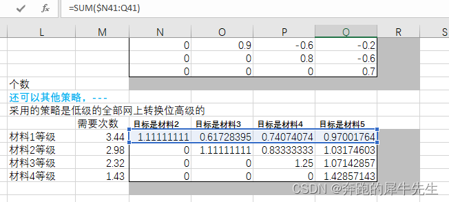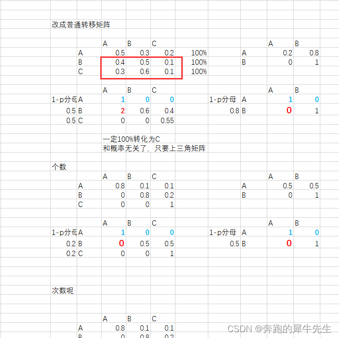 - step3: 每随机n次,转移概率矩阵^n次方。但是实际计算的时候,因为excel只有矩阵相乘函数 mmult(数组,数组),但是没有矩阵乘方函数,所以在EXCEL内计算做法只能是每随机1次,转移概率矩阵乘方结果*最初的矩阵