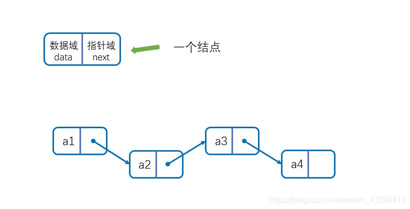 n个结点链结成一个链表,即为线性表的链式存储结构,因为此链表的每个结点中只包含一个指针域,所以叫做单链表。(示意图如下)