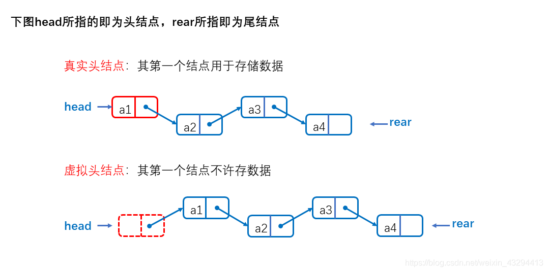 头结点是指链表中第一个节点,有真实头结点和虚拟头结点之分。