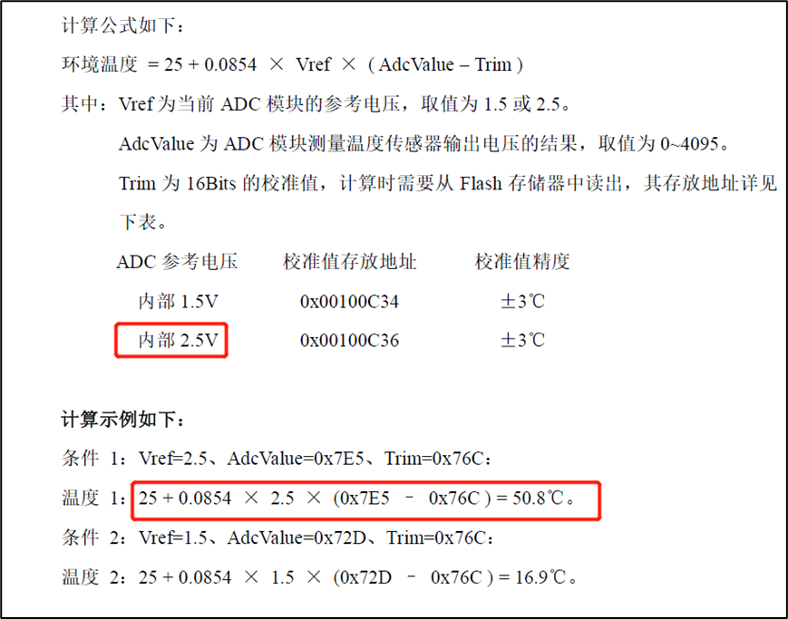 }void get_temperature(void){if(TRUE == Adc_GetIrqStatus(AdcMskIrqSgl)){// 获取采样值Trim = *((uint16_t *)(0x00100C36)); // ▲ 2.5V对应的地址u32AdcRestult = Adc_GetSglResult();temperature = 25 + 0.2135 * (float)(u32AdcRestult - Trim );// ▲ 0.2135 = 0.0854 ×2.5Adc_ClrIrqStatus(AdcMskIrqSgl); }