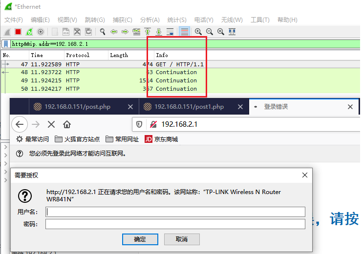 分析HTTP协议怎会少了Wireshark?区分Web是以Get Method还是以Post Method发送密码对Wireshark而言简直是小菜一碟:选择网卡后,在"Display fitler"中输入http,然后刷新登入页面,回到Wireshark,分组列表的"Info"列会显示该登入页面使用何种Method发送密码。如下图,是我登入TP-Link路由器(TL-WR841N)管理页面时,Wireshark捕获的结果,TP-Link以Http Get Method方式发送密码: