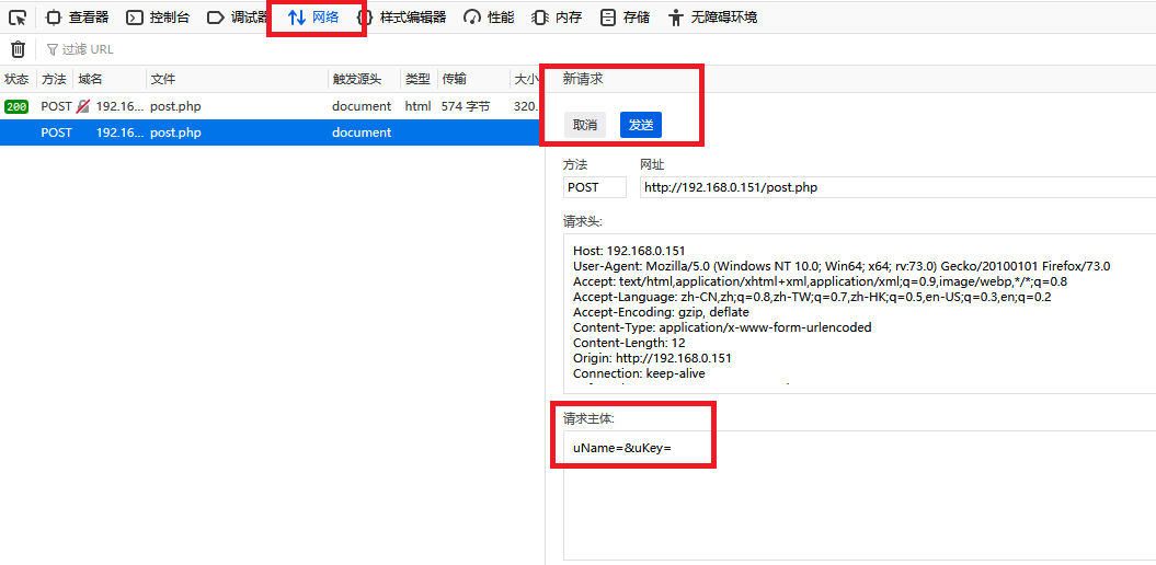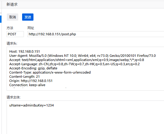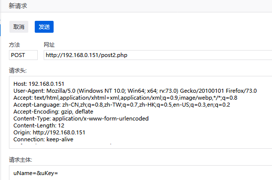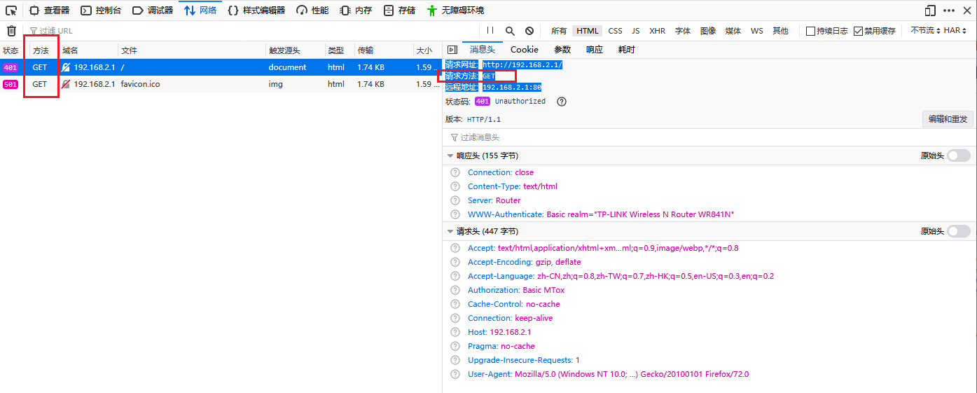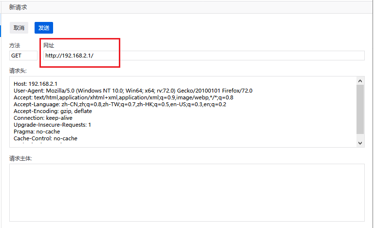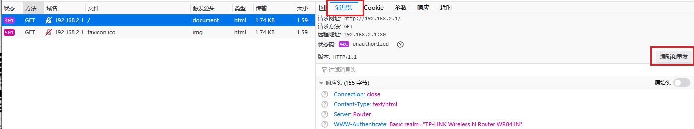 先从Get Method入手,靶机还是TP-Link的登陆页面。用hydra爆破Get Method类型的登陆页面,需要关注2个信息:服务器IP和登陆页面(Login Page)。在Firebug-网络标签页中选择一个请求-进入右侧的消息头(Headers),点击"编辑和重发"按钮,Firebug会列出在新请求(New Request)框中IP和登陆页面的信息: