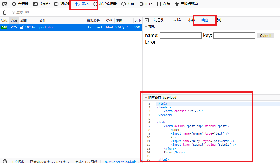 错误消息位于:Firebug-网络-响应-响应载荷(payload),(PS:错误消息作为hydra区分登录是否成功的重要参考信息。并不需要提取全部错误消息,只需要找到代表性的登录错误提示即可),如下图: