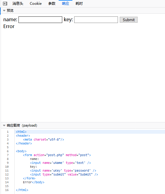 先看一个简单的页面(老婆做的页面...),输入错误的密码后会在页面上打印一段错误消息,比如我输入name:admin,key:1234,看下Firebug的输出:
