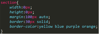 说明:我们在盒模型中知道,边框始终是长在元素宽高之外的,很明显上图的效果就是用边框撑开的一个矩形,并且我们把注意点放在四条边框交汇的地方,不难发现其中的道理。