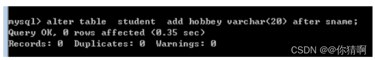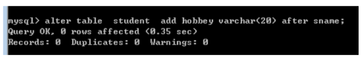 1. 语法 : alter table 表名 add 列名 数据类型 ( 长度 ) after 已经存在的列名