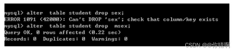 1. 语法 :update 表名 set 列名 = 值 , 列名 = 值 where 条件 2. 例子 : UPDATE student SET sname ="毛哥 " ,spwd="123" WHERE sid =1; 3. 注意点 : 执行修改的操作的时候 需要根据条件来进行修改