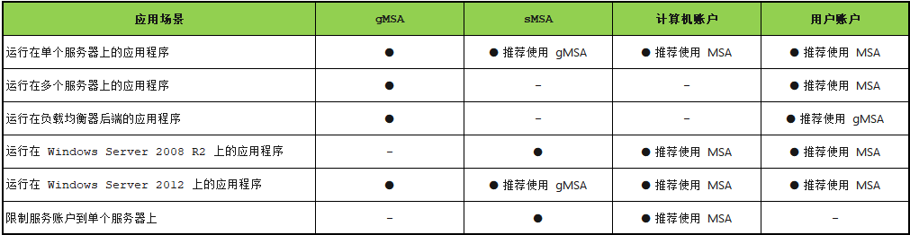 2)独立托管服务帐户(standalone Managed Service Account,sMSA)是一个托管域帐户,它提供自动密码管理、简化的服务主体名称(Service Principal Name,SPN)管理以及将管理委托给其他管理员的能力。此类型的托管服务帐户是在 Windows Server 2008 R2 和 Windows 7 中引入的。