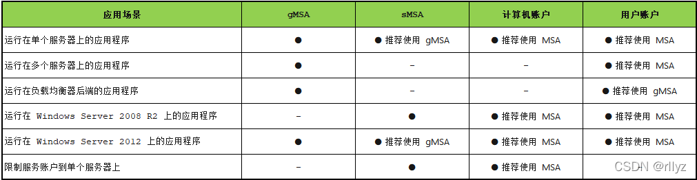 3)组托管服务帐户(group Managed Service Account,gMSA)在域中提供相同的功能,但也在多个服务器上扩展了该功能。连接到服务器场中托管的服务(如网络负载均衡解决方案)时,支持相互身份验证的身份验证协议要求服务的所有实例使用相同的主体。将 gMSA 用作服务主体时,Windows 操作系统管理帐户的密码,而不是依赖管理员来管理密码。