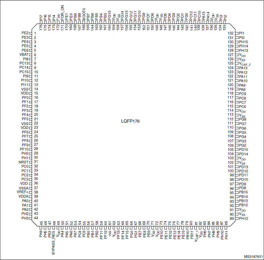 下图是这次使用的STM32开发版引脚图,它拥有176个引脚