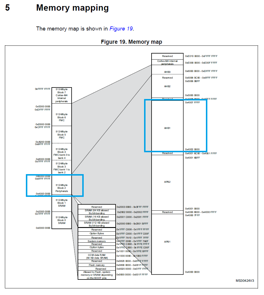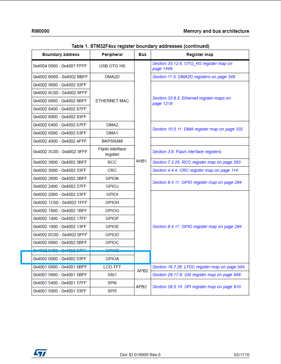 假设我们想实现GPIOA的暂存器控制,首先必须知道GPIOA的起始地址,于是参考STM官方网站的reference manual手册中的记忆体映射表可以找到GPIOA的地址范围,下图蓝色方框显示GPIOA的起始地址为0X4002 0000