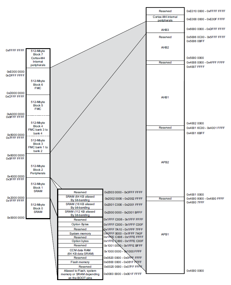 为了方便理解,我们从STM官方网站下载相应的data sheet(我的开发版使用STMF429),从下图可以看出记忆体的映射图范围为0x0000 0000~0xFFFF FFFF,总共有4294967296个,也就是4G大小的空间。请注意4G大小并不代表核心版的真实储存大小,而是核心版有能力表示这麽大的空间,这两者是有差别的