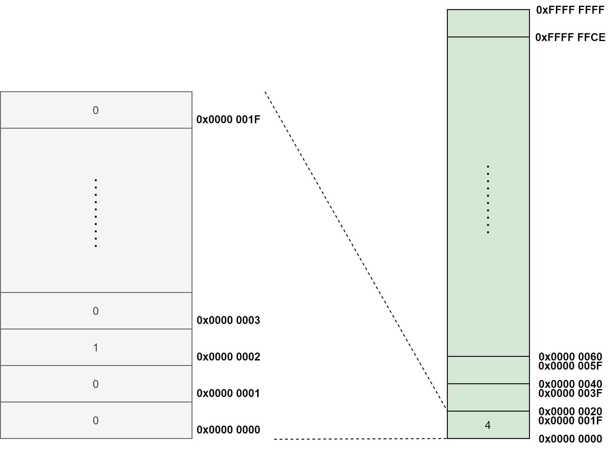 我们假设一个长度为32bits的暂存器,它储存了一个整数型态的数据,数值为4,将4转换成二进位制等于0000 0000 0000 0000 0000 0000 0000 0100,我们分别把这一连串二进位数值存放到0x0000 0000~0x0000 001F的地址空间中,这一块32bits长度的连续空间就称为暂存器