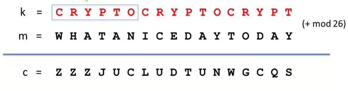 维吉尼亚密码实质上是对移位密码的一种改进,移位长度将循环变化。例如 k = C R Y P T O k=CRYPTO k=CRYPTO时,明文的移位长度依次为C,R,Y,P,T,O,C,R…