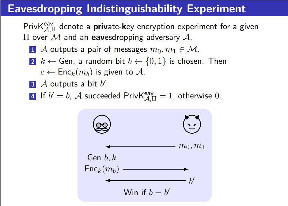 人话:有个加密方案 Π \varPi Π,现在喊一个敌手 A \mathcal{A} A过来, A \mathcal{A} A构造了两个明文,机器随机选了一个去加密并给出密文, A \mathcal{A} A需要判断机器选了哪个,判断对了就赢了,赢了表示成 P r i v K A , Π e a v = 1 PrivK_{\mathcal{A,\varPi}}^{eav}=1 PrivKA,Πeav=1.