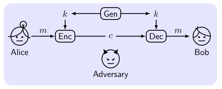 用Alice和Bob代指信息的发送方和接收方,在一个密码学系统中,通常默认加密算法和解密算法是公开的(事实上评价密码的安全性决不能对算法是否保密有所依赖),从敌手Adversary的角度考虑攻击,以此讨论密码的安全性。