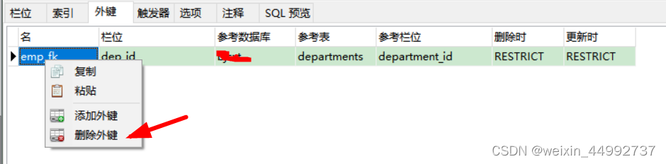 使用DDL 语句删除外键约束。或者在Navicat中主动删除外键。ALTER TABLE 表名 DROP FOREIGN KEY 约束名;
