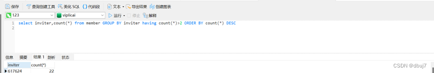 把上面查询进行倒序排序,发现ID为617624的人有最多的22个下线