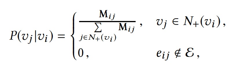 最基本的方法是根据用户行为,构建以商品为node的图,然后通过random walk生成商品的序列,再利用skip-gram算法,生成商品的表示向量,这称为Base Graph Embedding(BGE)。具体来看阿里是怎么操作的,如图1所示。图1(a)表示3个用户购买过的商品,并按照时间顺序做了排列,比如用户U1先后购买了D A B三个商品。这里有一个业务上的技巧,就是把用户在某个时间窗内的连续行为作为一个session,例如一个小时,如果超过时间窗,就划分为不同的session。通常在短周期内访问的商品更具有相似性。根据购买顺序构建有向图,如图1(b)所示,记录了从商品i到商品j的出现次数。计算商品的转移概率,并根据转移概率做游走,生成商品序列,如图1(c)所示。其中转移概率公式如公式(1)所示,