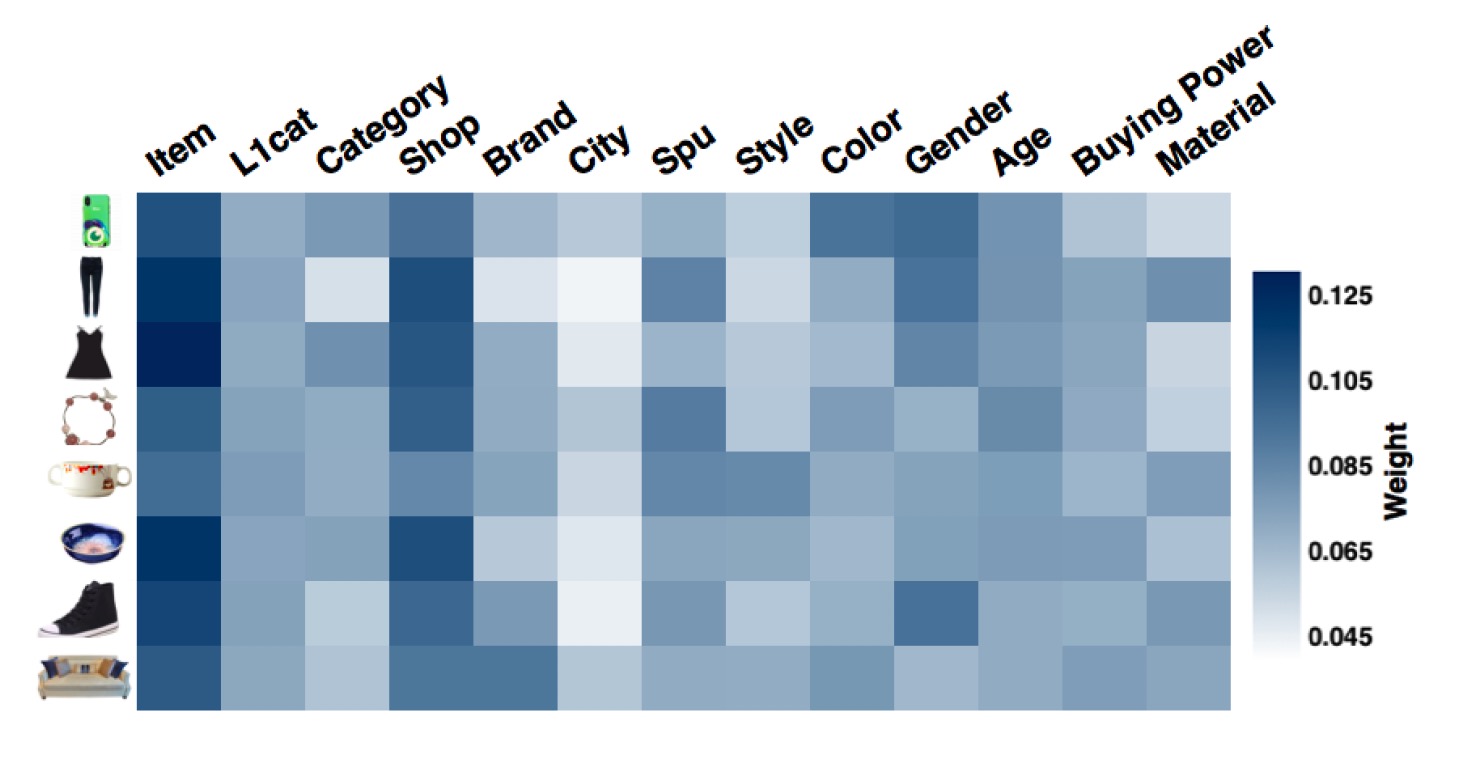 图3是抽取的8个不同的商品,在各个边信息上的权重的分布。可以看到,对每个商品,不同的边信息有不同的权重。最重要的还是item本身的向量,第二重要的是shop这个边信息。