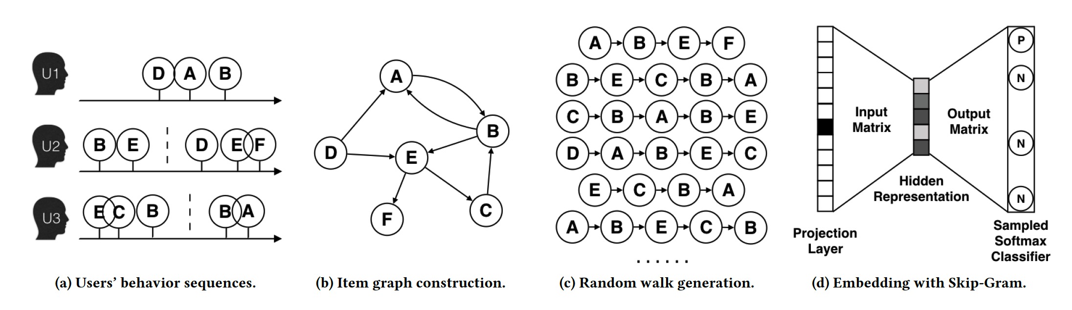 的直接邻域。最后根据skip-gram训练商品的向量表示,如图1(d)所示。