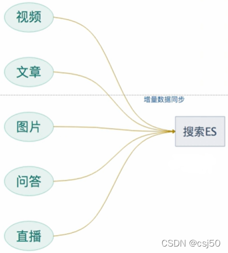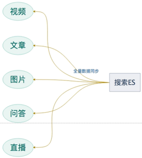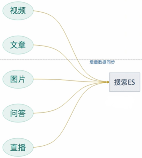 每新增一条数据,就实时推送给ES搜索服务,例如增加一条视频数据,视频就推送给搜索服务。