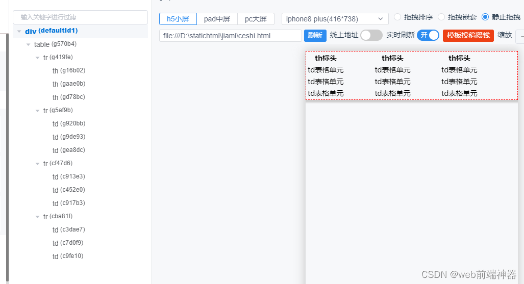 其中表格标签里还含有tr标签,th标签,td标签。tr标签则表示一行,td标签则表示行里的每一列,而th标签则表示表格的头部标题,th标签除了表示与现实头部标题以外,还有一个很重要的作用就是它可以控制对应列里宽度,这样如果发现内容显示不全的情况下,我们就可以在guiplan里拖拽th标签的宽度即可。