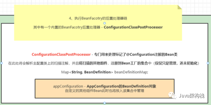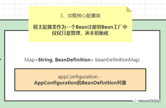 加载的代码较为复杂,这里就不给出了,小伙伴理解为主配置被作为普通的Bean对象,放入刚创建好的BeanFactory里就可以了,此时只是注册了Bean的信息,还未初始化为对象。