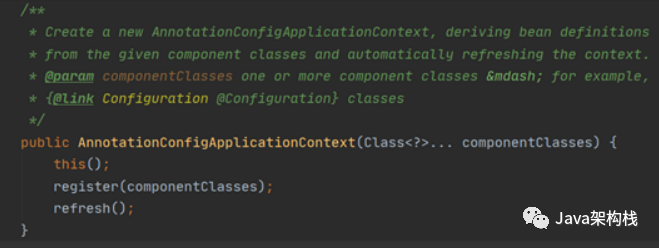 当前实际开发过程中,IOC容器肯定是随着Web服务器启动而启动的。下图是AnnotationConfigApplicationContext容器的其中一个构造方法(基于主配置类的容器创建)