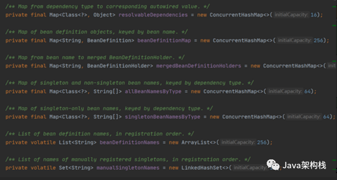 再来看下DefaultListableBeanFactory中的核心集合部分,这些集合主要保存Bean的描述信息(BeanDefinition)。当然这个时候,这些集合都是空的。