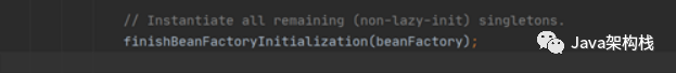 接下来我们看下初始化Bean的核心方法,从名字就可以看出,完成BeanFactory的初始化,注释意为,初始化所有的非懒加载单例Bean。