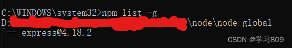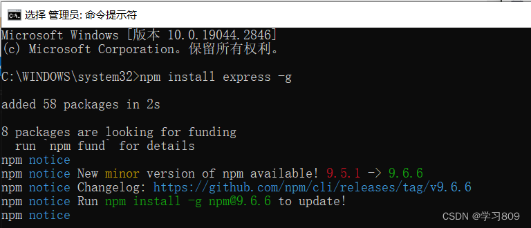输入下面的代码安装一下express(记得一定要以管理员身份运行命令行)