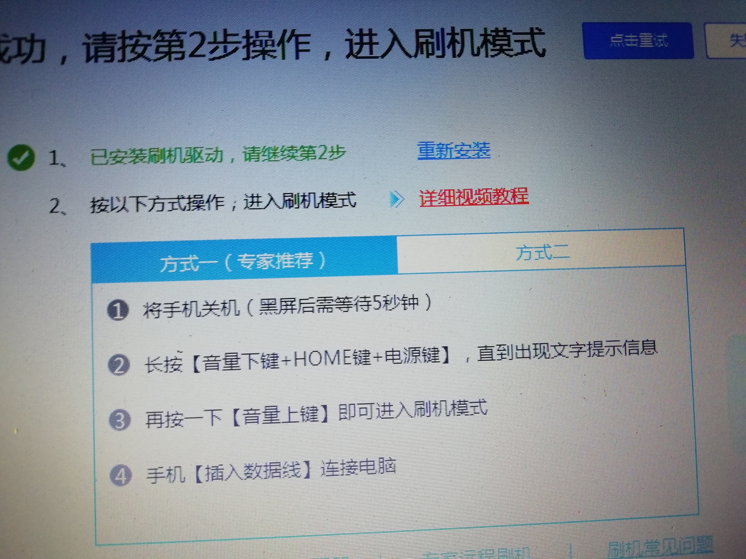(1)按住home+下音量键+开机键后,按下音量键才能开始刷机。