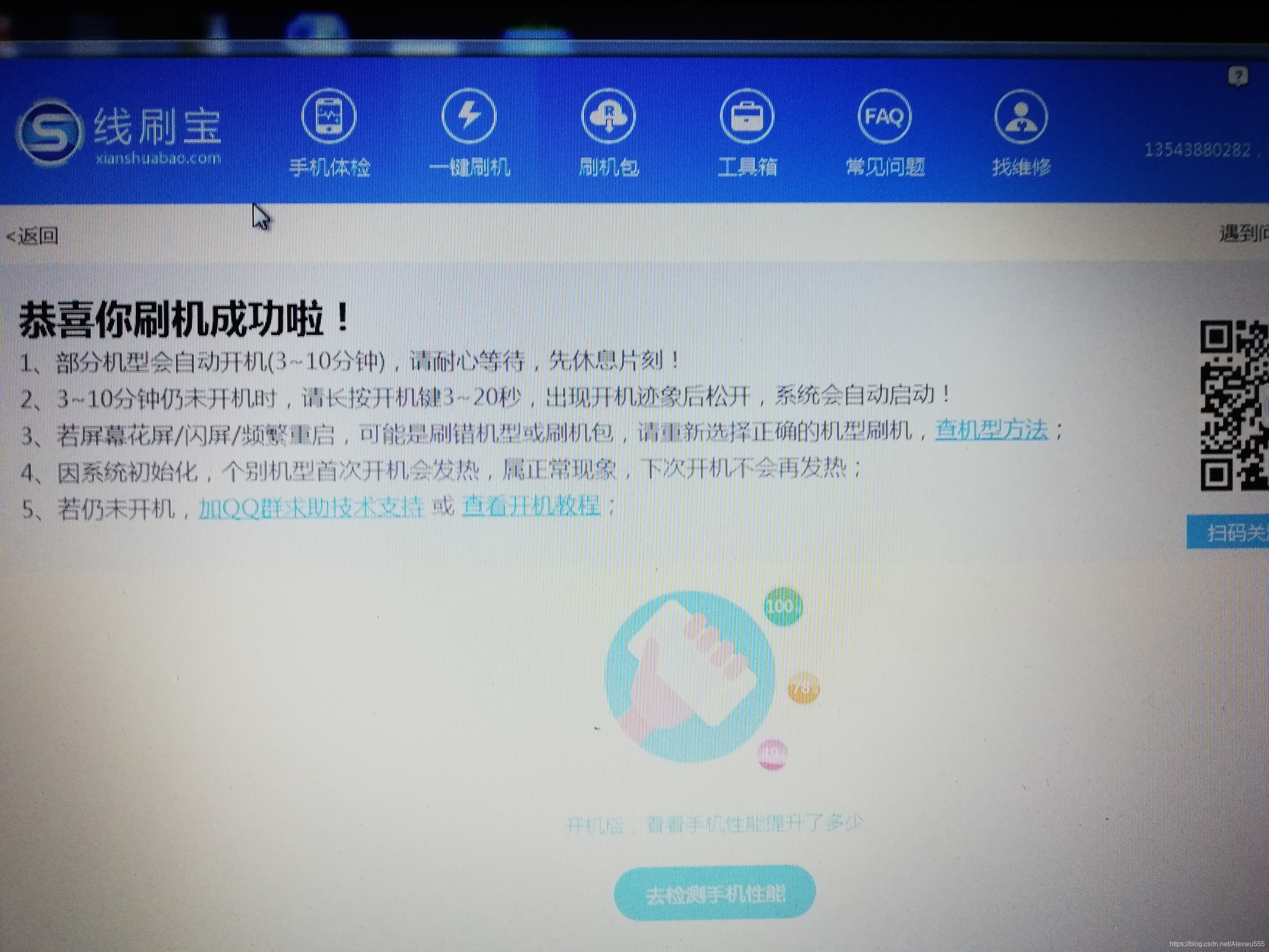 (3)刷机完成的第一次自动开机并不存在,等了十几分钟后,我拆了电池,重装,重新开机。