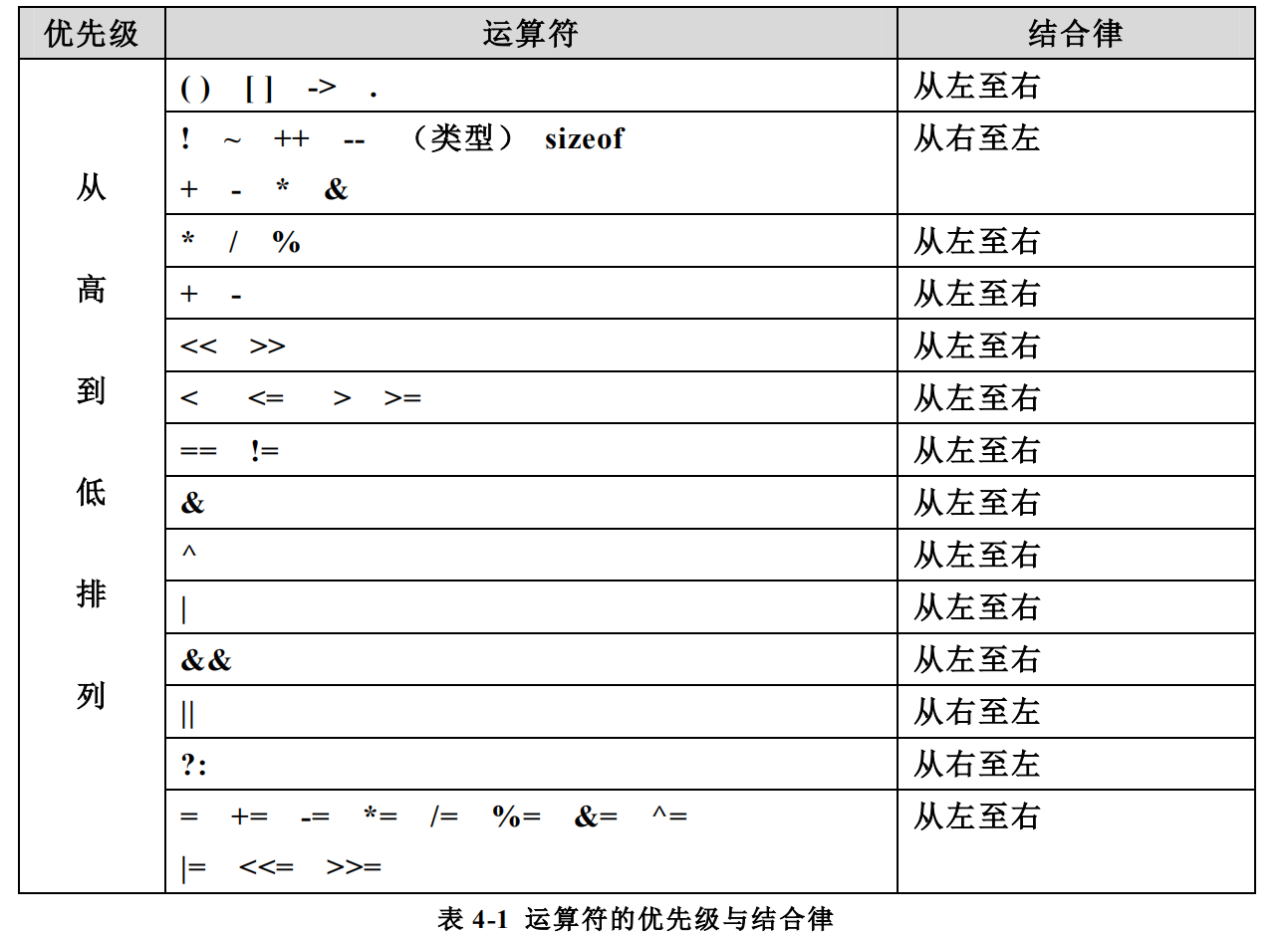 C++/C 语言的运算符有数十个,运算符的优先级与结合律如表 4-1 所示。注意一元 运算符 + - * 的优先级高于对应的二元运算符