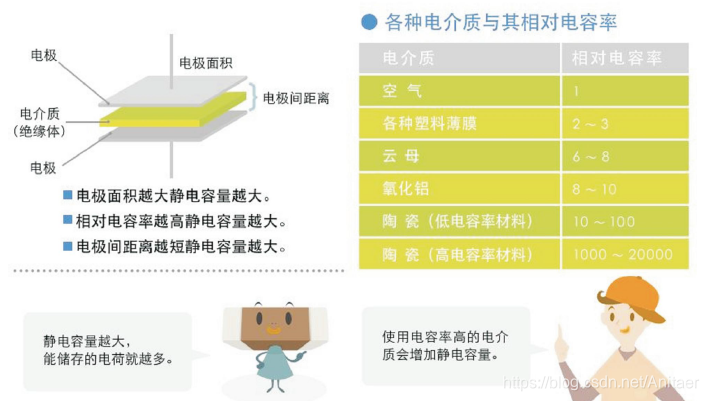 电容器储存电荷的能力称作静电容量,电极面积越大或电极间距离越短,则静电容量越大,根据电极板间的绝缘体(空气或电介质)性质不同,静电容量也会有很大的不同,用来表示这种关系的是相对电容率