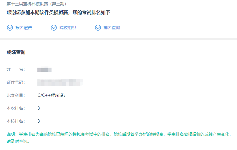 反省:总体来说蓝桥杯校内赛难度并不大,还交了30块报名费,大多数编程题都是可以暴力直接解决,不需要太多关于算法的技巧,前面的填空题需要一些DS的基础,例如树,图什么的都要学到。我个人基础还是不够牢固。如果想参加蓝桥杯的话,可以去力扣或者牛客网刷一下题再参加,适应一下难度,多刷题,坚持,努力,上进。