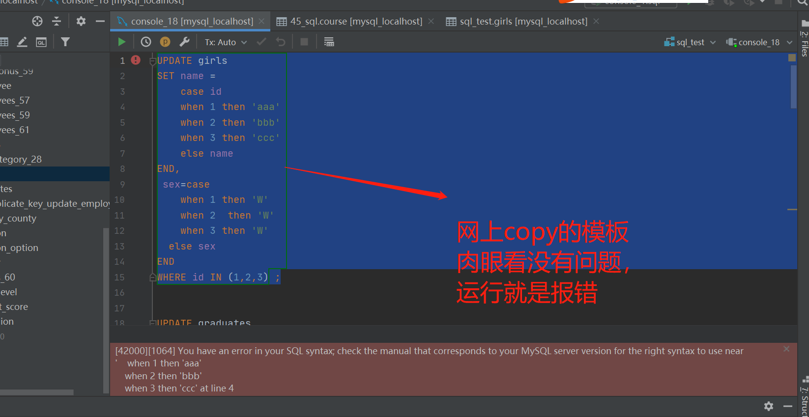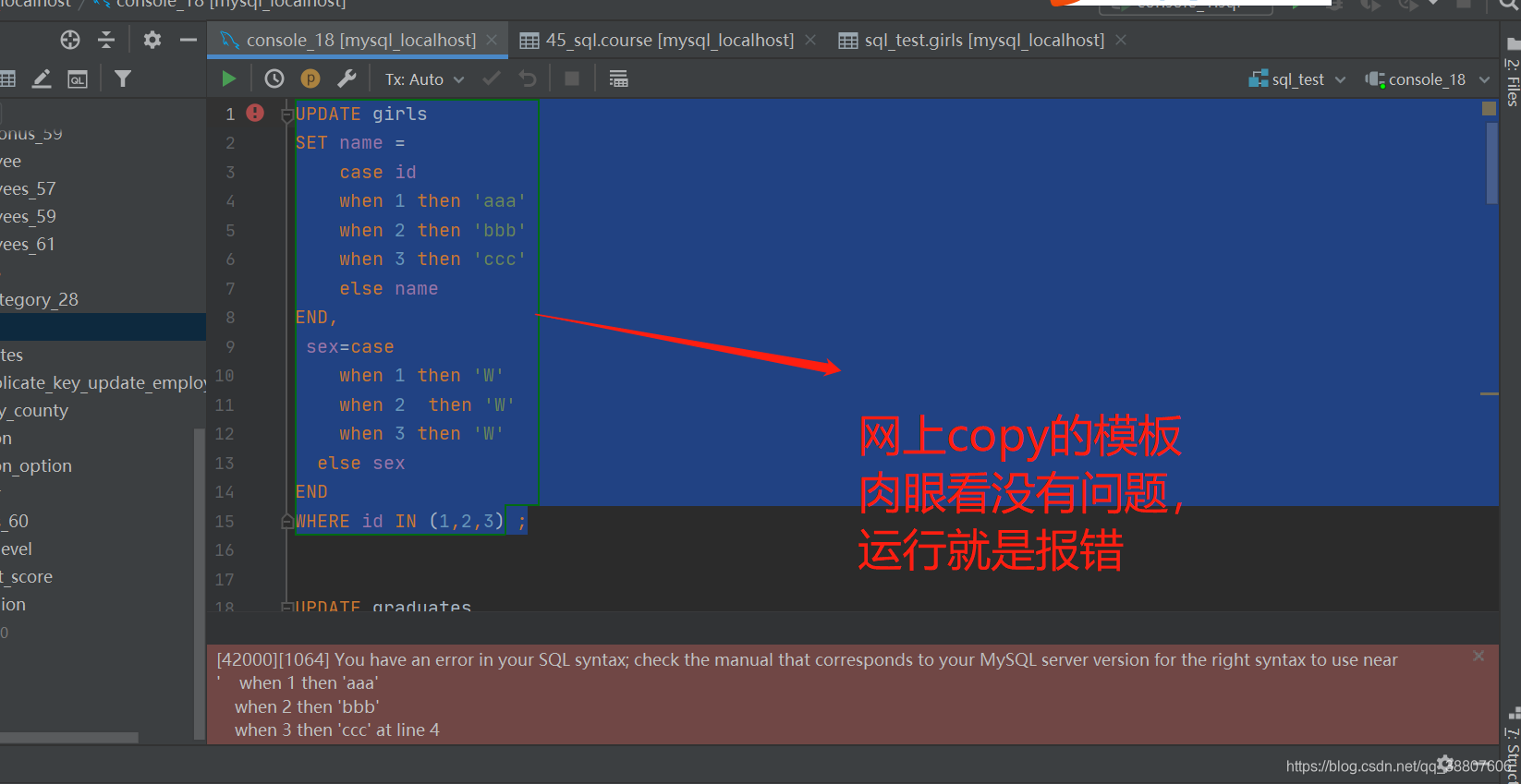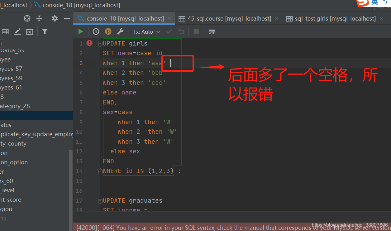 case when then else end的正确sql如下:(不要在网上copy 示例,要尽量自己写,网上有的示例自己copy过来,运行时候,可能有特殊字符,肉眼无法发现,最终报错:排查了一个上午最终决定自己写一下子就出来了,原因在最底下,告诫自己以后不要犯类似的错误)