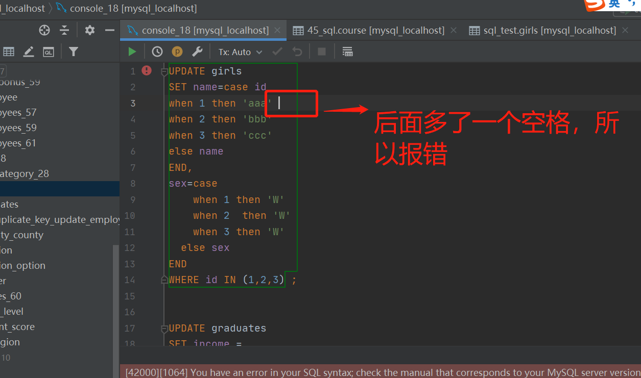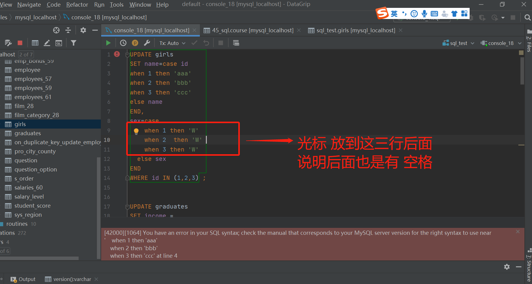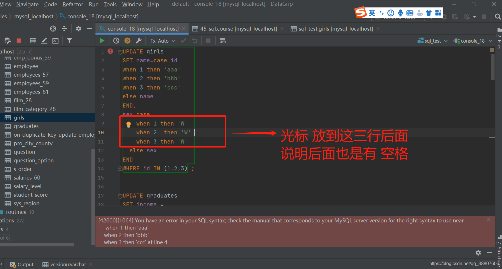 case when then else end的正确sql如下:(不要在网上copy 示例,要尽量自己写,网上有的示例自己copy过来,运行时候,可能有特殊字符,肉眼无法发现,最终报错:排查了一个上午最终决定自己写一下子就出来了,原因在最底下,告诫自己以后不要犯类似的错误)