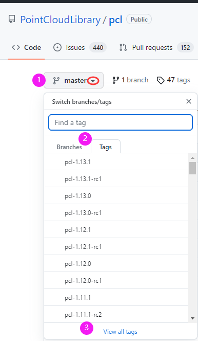 打开GitHub网站,搜索pcl,选择第一个结果打开,按照下图步骤操作