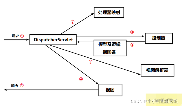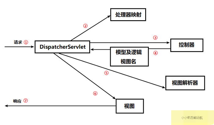 1 ,用户发送请求至前端控制器DispatcherServlet