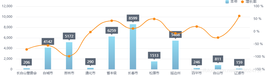 initLineBar(dom, pxToVh, dataList, time) {let lData = [time]if (!dataList.yd2.length == 0) {lData.push('增长率')}let myChart = echarts.init(dom)let option = {grid: {left: '8%',right: '6%',top: '10%',bottom: '10%'},title: {show: false},tooltip: {trigger: 'axis',axisPointer: {// 坐标轴指示器,坐标轴触发有效type: 'shadow' // 默认为直线,可选为:'line' | 'shadow'}},legend: {data: lData,right: '3%',top: '0',itemWidth: pxToVh * 0.81,itemHeight: pxToVh * 0.81,textStyle: {color: '#5A6271',fontSize: pxToVh * 0.88}},toolbox: {show: false},xAxis: [{type: 'category',boundaryGap: true,show: true,axisTick: {show: false},axisLabel: {fontSize: pxToVh * 0.81,color: '#5A6271',margin: 8,interval: 0,data: dataList.xd},axisLine: {lineStyle: {type: 'solid',color: '#EAEAEC', //左边线的颜色width: '1' //坐标线的宽度}},data: dataList.xd}],yAxis: [{type: 'value',scale: true,name: '',axisLine: {show: false},splitNum: 6,axisTick: {show: false},splitLine: {lineStyle: {color: '#EAEAEC'}},axisLabel: {fontSize: pxToVh * 0.81,color: '#5A6271',margin: 12},min: 0,boundaryGap: [0.2, 0.2]},{type: 'value',scale: true,axisLine: {show: false},splitNum: 6,axisTick: {show: false},axisLabel: {fontSize: pxToVh * 0.81,color: '#5A6271',margin: 12,formatter: '{value} %'},splitLine: {show: false,lineStyle: {// 使用深浅的间隔色color: '#EAEAEC'}},name: '',// max: 30,// min: 0,boundaryGap: [0.2, 0.2]}],series: [{name: lData[0],type: 'bar',label: {normal: {show: true,position: 'top',textStyle: {color: '#FFFFFF'},fontSize: pxToVh * 0.81,padding: [0, pxToVh * 0.51],backgroundColor: {image: '/static/img/tooltip_num_bg.png'},formatter: function(params) {for (var i = 0, l = option.xAxis[0].data.length; i < l; i++) {if (option.xAxis[0].data[i] == params.name) {// var val1 = params.value || 0let val2 = option.series[0].data[i] || 0return `{a|${val2}}`}}},rich: {a: {height: pxToVh * 2.01,color: '#fff'}}}},itemStyle: {normal: {zlevel: 2,color: new echarts.graphic.LinearGradient(0,1,0,0,[{offset: 0,color: '#78B0CF'// 0% 处的颜色},{offset: 1,// 100% 处的颜色color: '#92DCF3'}],false)}},barWidth: pxToVh * 1.54,yAxisIndex: 0,data: dataList.yd1},{name: '增长率',yAxisIndex: 1,symbol: 'circle',symbolSize: pxToVh * 0.59,smooth: true,color: '#FA8C16',label: {normal: {show: false,position: 'top',textStyle: {color: '#FA8C16'}}},lineStyle: {color: '#FA8C16'},type: 'line',data: dataList.yd2}]}myChart.setOption(option)return myChart},