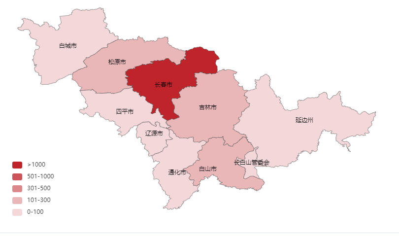 initMap(dom, pxToVh, dataList) {console.log(dataList)let myChart = echarts.init(dom)let option = {tooltip: {trigger: 'item',formatter: function(params) {return params.name + '案件数 : ' + params.value}},visualMap: {min: 0,max: 999999999,left: 'left',top: 'bottom',showLabel: !0,show: !0,pieces: [{ min: 1000, color: '#BF242A', label: '>1000' },{ min: 501, max: 1000, color: '#CD5459', label: '501-1000' },{ min: 301, max: 500, color: '#DC878A', label: '301-500' },{ min: 101, max: 300, color: '#EAB7B9', label: '101-300' },{ min: 0, max: 100, color: '#F3D7D9', label: '0-100' }]// color: ['#eeeeee', '#db7037']},series: [{type: 'map',map: nameP,label: {normal: {show: true}},emphasis: {color: 'auto'},aspectScale: 1,zoom: 1.2,data: dataList// data: [// {// name: '长春市',// value: 0// },// {// name: '吉林市',// value: 0// },// {// name: '长白山管委会',// value: 0// },// {// name: '白城市',// value: 0// },// {// name: '松原市',// value: 0// },// {// name: '延边州',// value: 0// },// {// name: '四平市',// value: 0// },// {// name: '白山市',// value: 0// },// {// name: '辽源市',// value: 0// },// {// name: '通化市',// value: 0// },// {// name: '省本级',// value: 0// }// ]}]}myChart.setOption(option)return myChart}