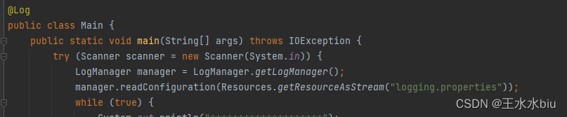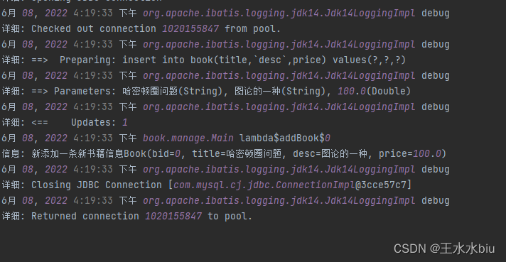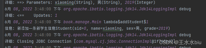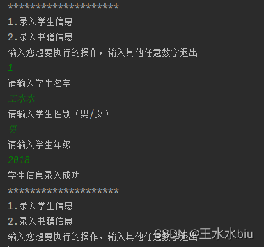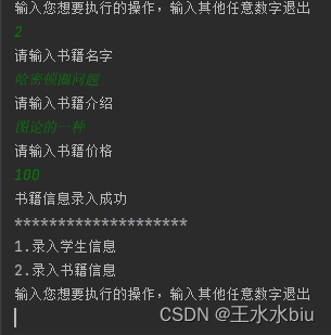 public class Main {public static void main(String[] args) throws IOException {try (Scanner scanner = new Scanner(System.in)) {LogManager manager = LogManager.getLogManager();manager.readConfiguration(Resources.getResourceAsStream("logging.properties"));while (true) {System.out.println("********************");System.out.println("1.录入学生信息");System.out.println("2.录入书籍信息");System.out.println("输入您想要执行的操作,输入其他任意数字退出");int input;try {input = scanner.nextInt();}catch (Exception e){return;}scanner.nextLine();switch (input) {case 1:addStudent(scanner);break;case 2:addBook(scanner);break;default:return;}}}}private static void addBook(Scanner scanner){System.out.println("请输入书籍名字");String title =scanner.nextLine();System.out.println("请输入书籍介绍");String desc =scanner.nextLine();System.out.println("请输入书籍价格");String price =scanner.nextLine();double p = Integer.parseInt(price);Book book =new Book(title,desc,p);SqlUtil.doSqlWork(mapper ->{int i=mapper.addBook(book);if(i>0) {System.out.println("书籍信息录入成功");log.info("新添加一条新书籍信息" + book);}else System.out.println("书籍信息录入失败");});}private static void addStudent(Scanner scanner){System.out.println("请输入学生名字");String name =scanner.nextLine();System.out.println("请输入学生性别(男/女)");String sex =scanner.nextLine();System.out.println("请输入学生年级");String grade =scanner.nextLine();int g = Integer.parseInt(grade);Student student =new Student(name,sex,g);SqlUtil.doSqlWork(mapper ->{int i=mapper.addStudent(student);if(i>0) {System.out.println("学生信息录入成功");log.info("新添加一条新学生信息" + student);}else System.out.println("学生信息录入失败");});}