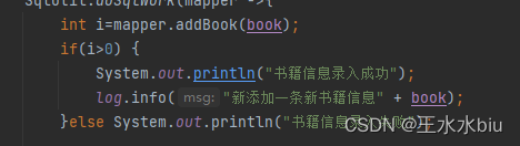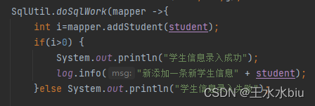 import java.util.function.Consumer;public class SqlUtil {private SqlUtil(){}private static SqlSessionFactory factory;static{try{factory = new SqlSessionFactoryBuilder().build(Resources.getResourceAsReader("mybatis-config.xml"));} catch (IOException e) {e.printStackTrace();}}public static void doSqlWork(Consumer consumer){try(SqlSession sqlSession= factory.openSession(true)){BookMapper bookMapper = sqlSession.getMapper(BookMapper.class);consumer.accept(bookMapper);}}