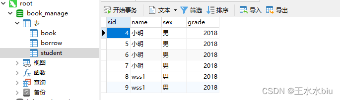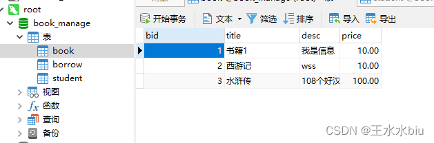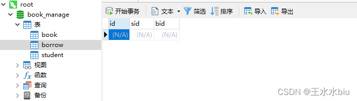 项目取名为BookManger,在Navicat中创建数据库为book_manage,包含三个表分别为学生,书籍,将学生与书籍连接起来的借阅表如下图