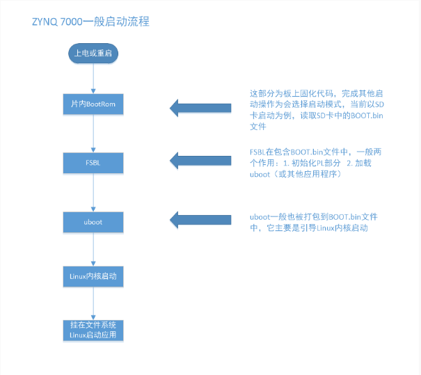 从上面的启动流程可以看到,其实ZYQN7000系列产品虽然是FPGA和SOC的结合体,但是它的启动还是和普通SOC启动很类似的,唯一的一个不同点就是增加了一个FSBL的过程。不过在实际开发中,正式由于FSBL阶段的引入导致ZYQN7000的开发复杂了很多,有很多都是需要软硬件相互交互的东西。