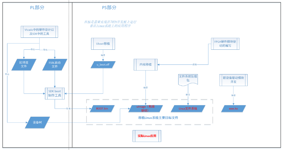 使用Vivada的SDK中的boot制作工具来创建BOOT.bin文件,文件名不能变,启动将以这个文件名的文件启动,除此之外还要根据硬件设计还要输出设备树文件,提供给Linux内核编译时使用。另外新的硬件模块,要在Linux中的应用程序中使用,还需要开发对应的Linux驱动。