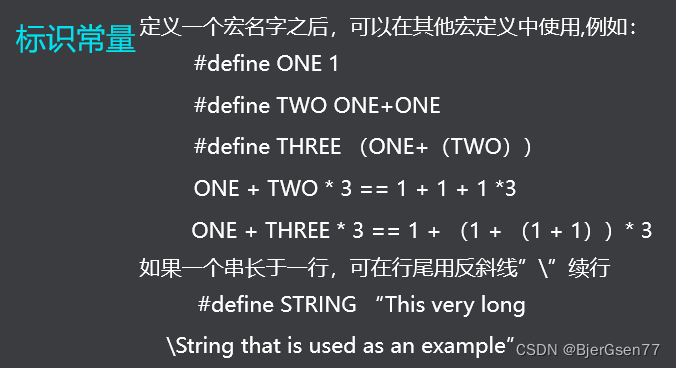 所谓标识常量是指用标识符代替常量使用的一种常量, 其名称通常是一个标识符。标识常量也叫符号常量,一般用大写英文字母的标识符。在使用之前必须预先定义。(注意这里仅仅是进行了替换,但是不会提前对预定义的常量进行运算)
